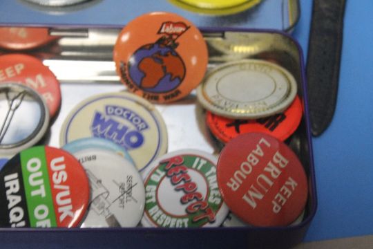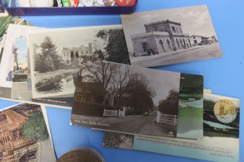 A QUANTITY OF COLLECTABLES TO INCLUDE POSTCARDS, GREEN SHIELD STAMPS, PIN BADGES ETC.