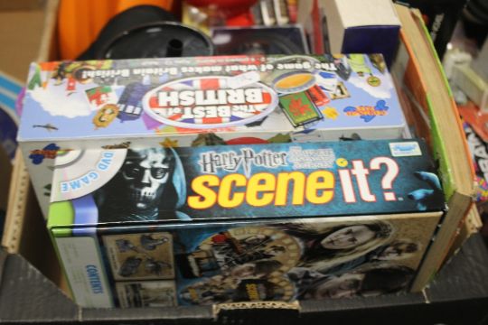 TWO TRAYS OF TOYS AND GAMES TO INCLUDE HARRY POTTER SCENE IT GAME, A STAR WARS REVERSABLE BELT, ETC. (TRAYS NOT INCLUDED)