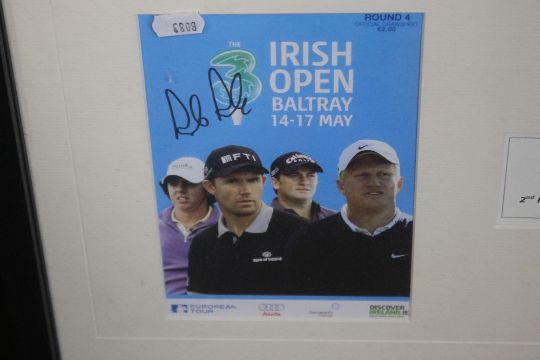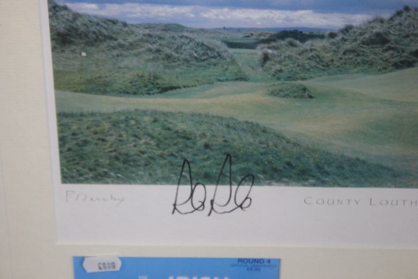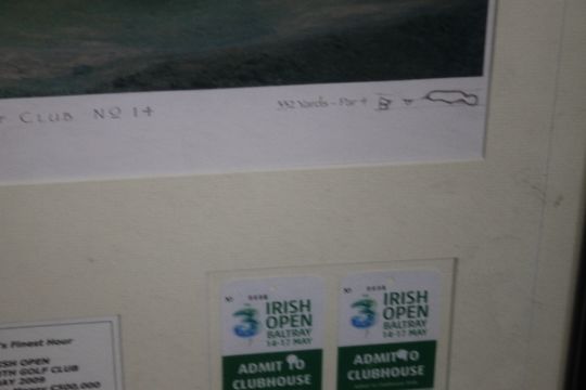 P. DAUBY, LIMITED EDITION PRINT ETC. "GOLF VIEW", IRISH OPEN, BALTRAY MAY SIGNED WITH GOLF MEMORABILIA WITHIN FRAME, 66 X 56 CM