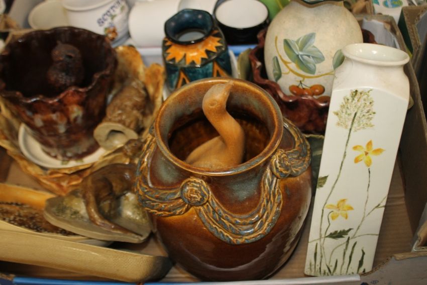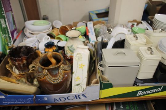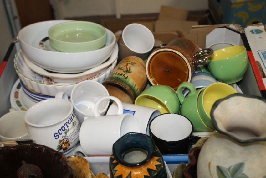 FOUR TRAYS OF CERAMICS, KITCHENALIA ETC. (TRAYS NOT INCLUDED)