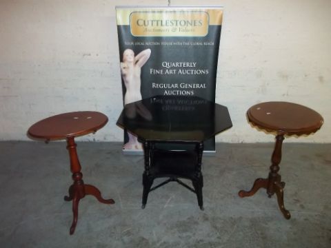 TWO PEDESTAL WINE TABLES AND ANOTHER LARGER TABLE (3)