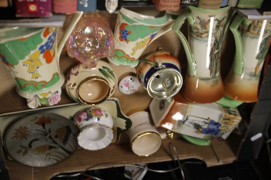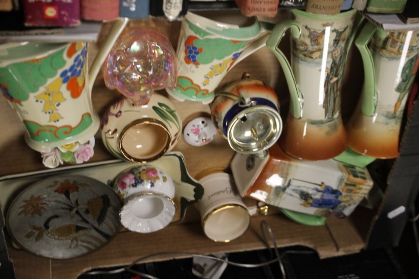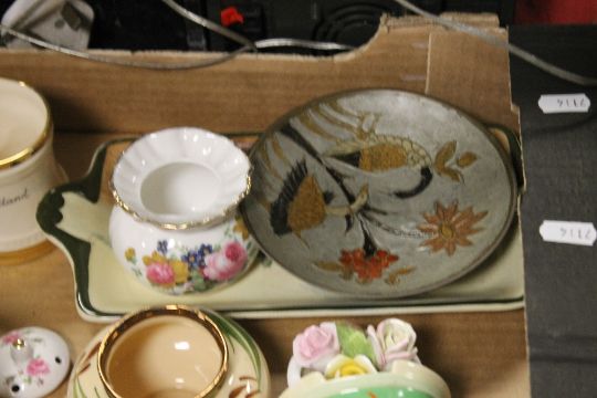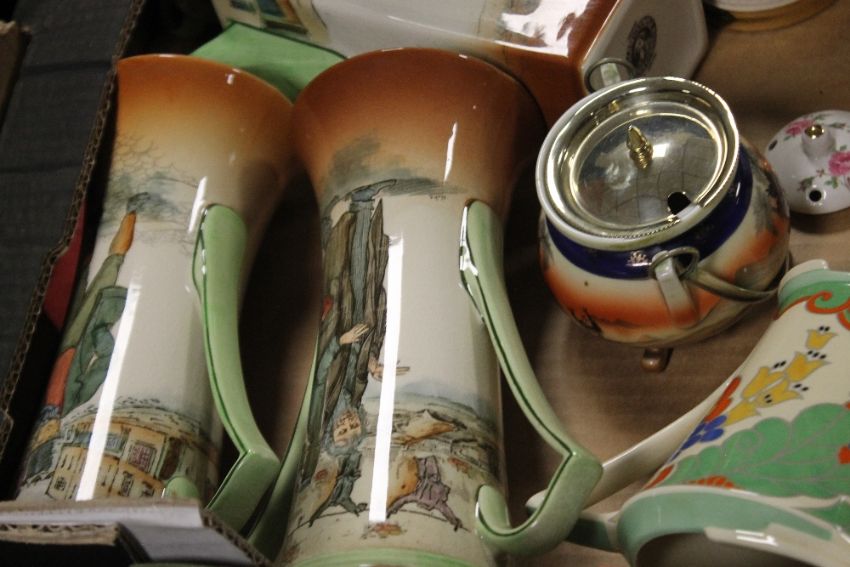 A TRAY OF CERAMICS TO INCLUDE ROYAL DOULTON AND A WARMING PAN