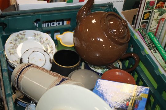 TWO TRAYS OF CERAMICS AND METALWARE TO INCLUDE STEINS (TRAYS NOT INCLUDED)