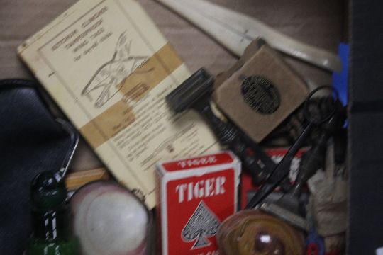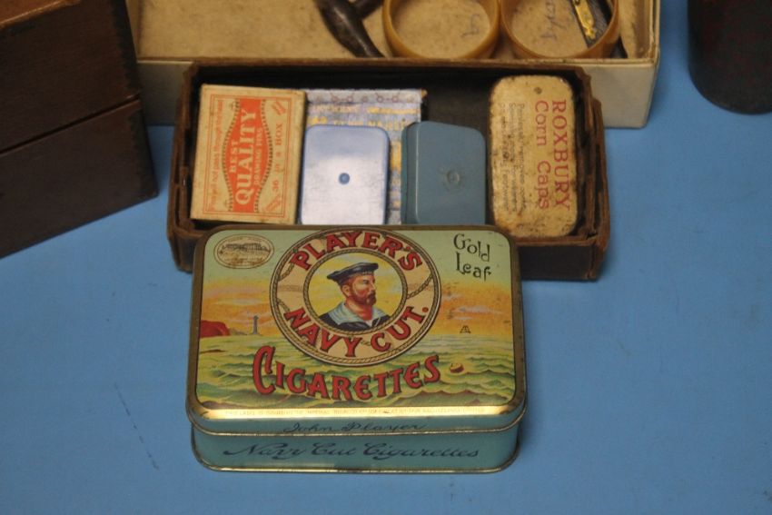 A BOX OF COLLECTABLES TO INCLUDE VINTAGE PLAYERS TIN, PLAYING CARDS, A BEAKER ETC.