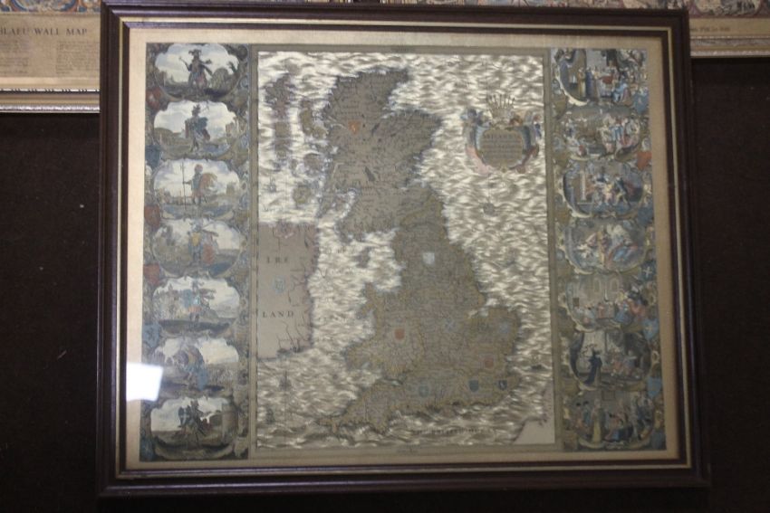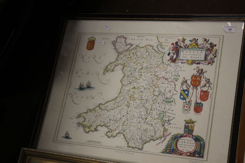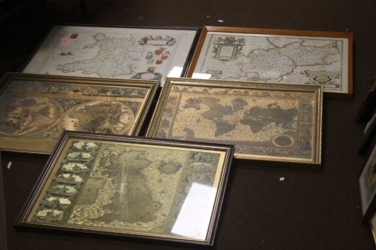 FIVE FRAMED REPRODUCTION MAPS TO INCLUDE WALES, WORCESTER GREAT BRITAIN ETC THE LARGEST 65 X 52 CM