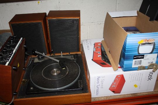 A McDONALD TURNTABLE, PRINZSOUND STEREO AMPLIFIER, MODERN PORTABLE RECORD PLAYER, CAMERAS ETC