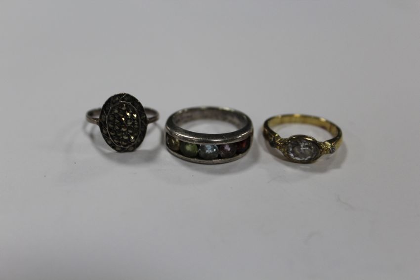 A MULTI GEM STONE SILVER DRESS RING, TOGETHER WITH A SILVER GILT EXAMPLE AND A SILVER AND MARCASITE RING (3)
