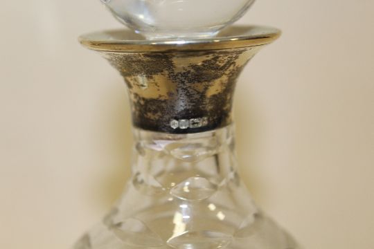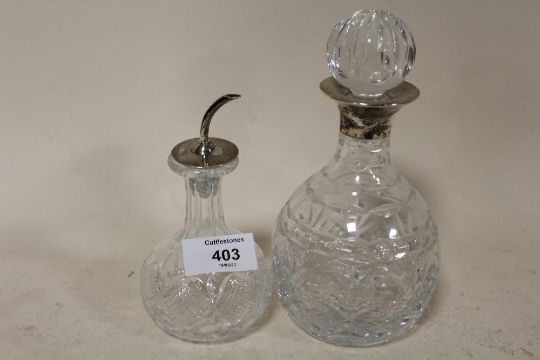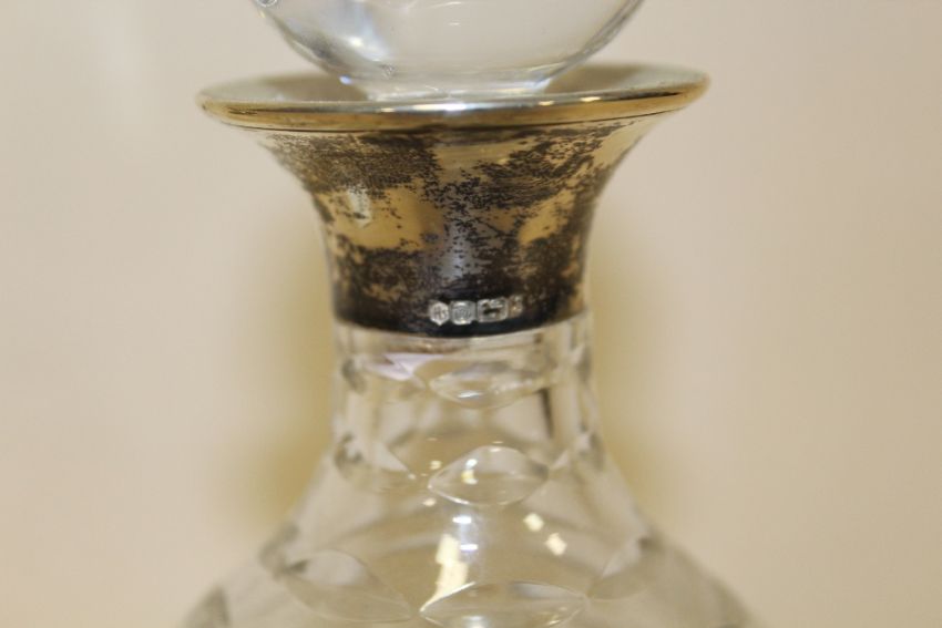 A SMALLER HALLMARKED SILVER RIMMED CUT GLASS DECANTER OVERALL HEIGHT INCLUDING STOPPER -17.5CM, TOGETHER WITH A SILVER TOPPED SCENT BOTTLE (2)