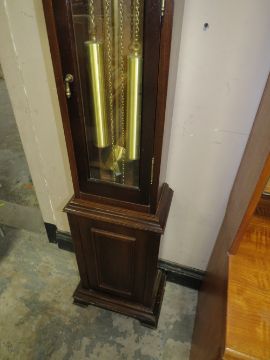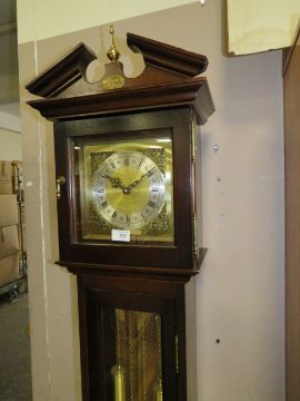 A MODERN MAHOGANY GRANDMOTHER CLOCK WITH TWO WEIGHTS AND PENDULUM