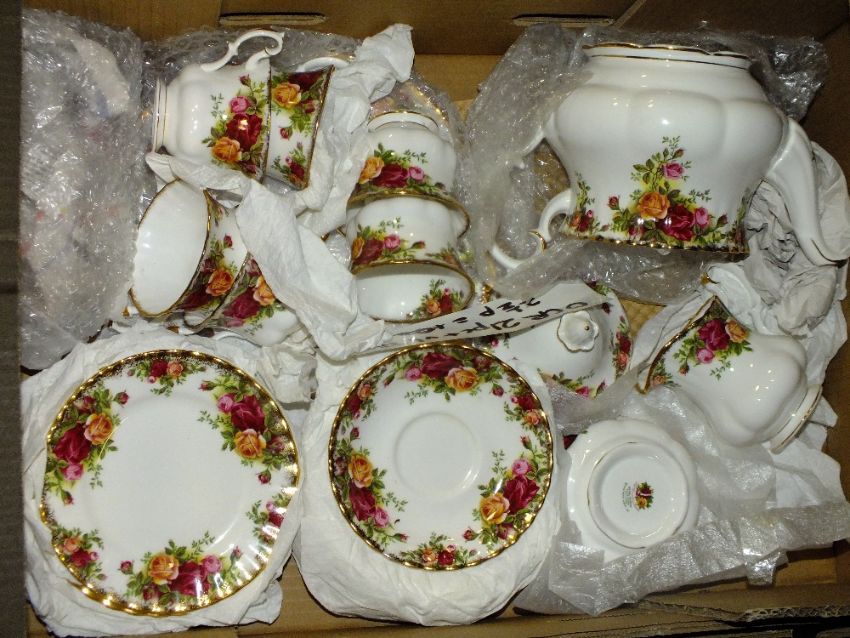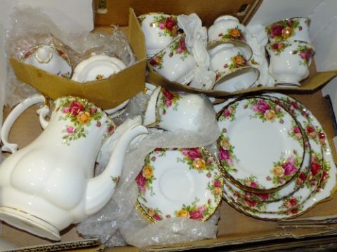 THREE TRAYS OF ROYAL ALBERT OLD COUNTRY ROSES CHINA, TEA AND COFFEE SET INCLUDING POTS, PLATES, CLOCK, PICTURE FRAME, CANDLE HOLDERS, VASE ETC. (OVER 70 PIECES)