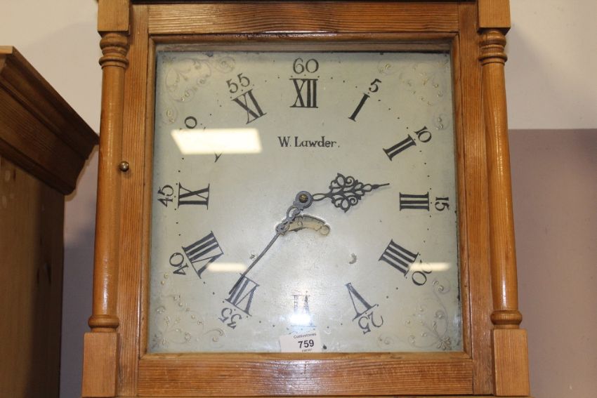 AN OLD PINE 30HR LONGCASE CLOCK BY W.LAWDER V- PENDULUM AND WEIGHT H-206 CM