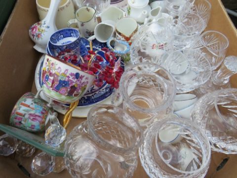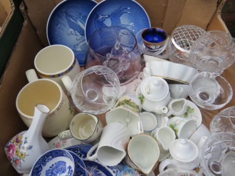 TWO TRAYS OF CERAMICS AND GLASSWARE TO INCLUDE ROYAL WORCESTER, COPENHAGEN, AYNSLEY AND COALPORT ETC