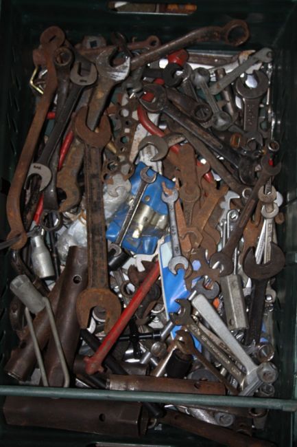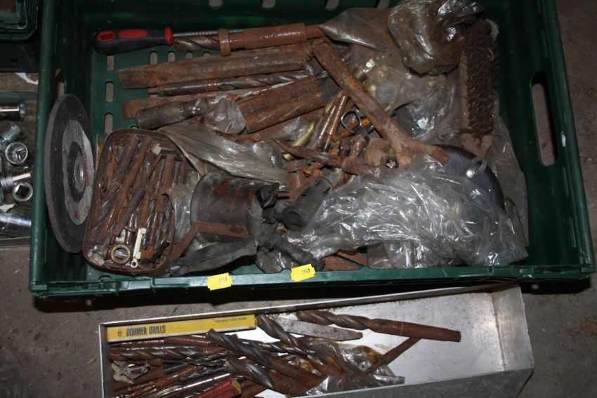 THREE BOXES OF MIXED TOOLS ETC TO INCLUDE SPANNERS AND DRILL BITS ETC