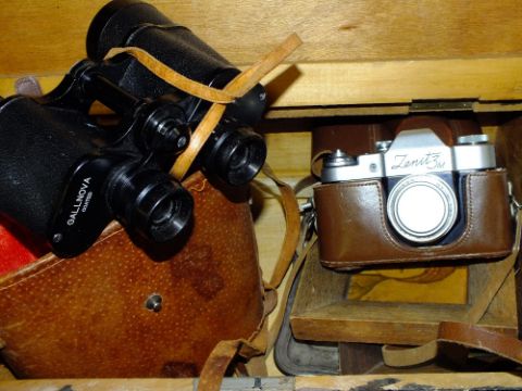 A LIDDED WOODEN BOX OF COLLECTABLES TO INCLUDE A PAIR OF CASED GALLNOVA 23 X 50 FIELD BINOCULARS AND ZENIT 3M CAMERA