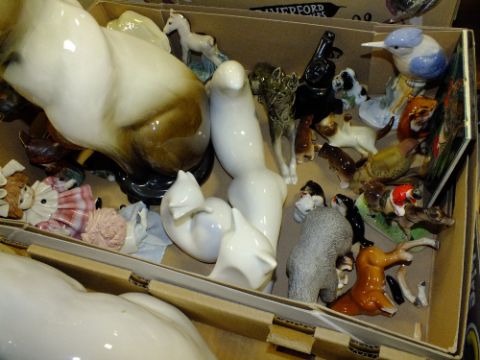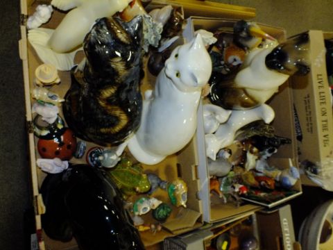 TWO TRAYS OF ASSORTED CERAMIC AND OTHER FIGURES TO INCLUDE FOUR LARGE SEATED CAT FIGURES