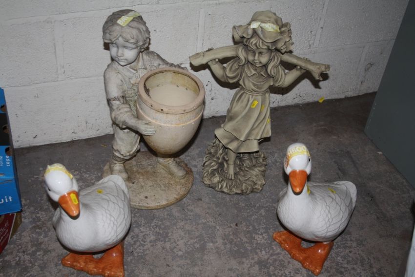 TWO GARDEN FIGURES TOGETHER WITH 2 CERAMIC GEESE