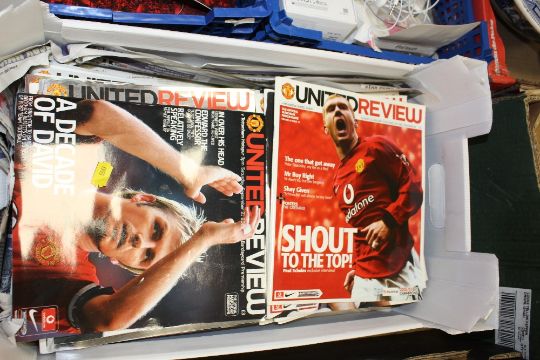 THREE BOXES OF MANCHESTER UNITED FOOTBALL REVIEW MAGAZINES AND FOOTBALL CARDS