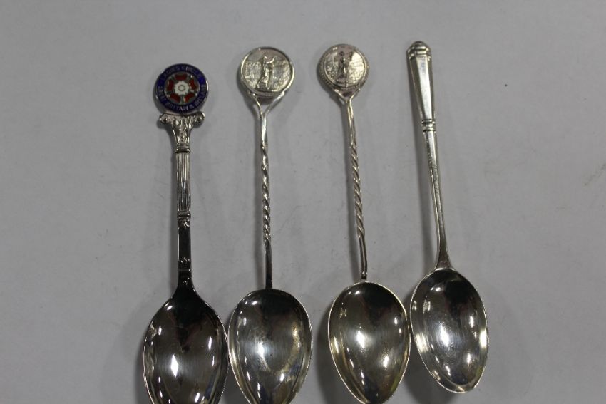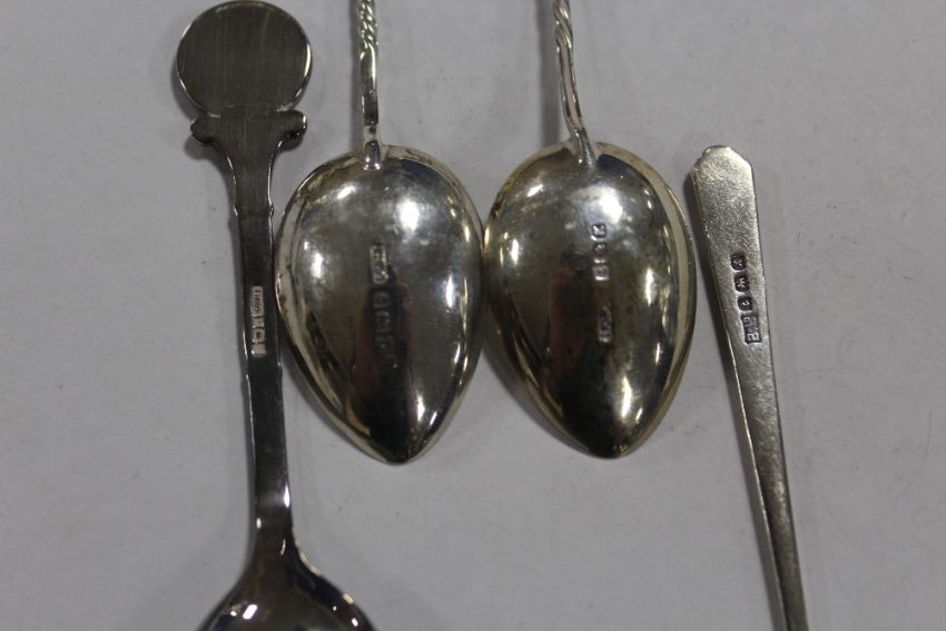 FOUR HALLMARKED SILVER TEASPOONS, TOGETHER WITH A HALLMARKED SILVER EGG CUP APPROX WEIGHT -76G