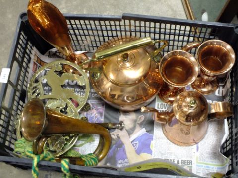 A TRAY OF METALWARE TO INCLUDE A COPPER KETTLE AND COPPER BUGLE