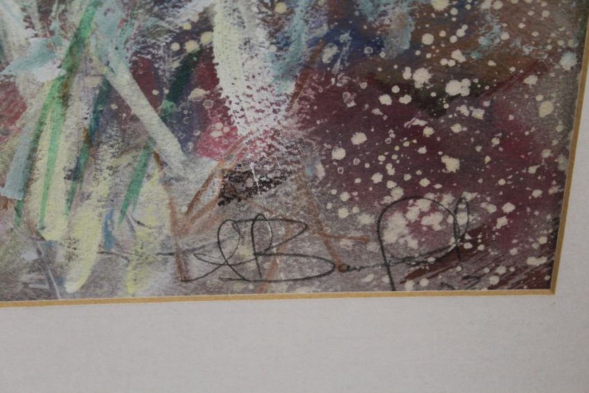 A LARGE FRAMED AND GLAZED IMPRESSIONIST WATERCOLOUR OF A LANDSCAPE SIGNED BAMFORD LOWER RIGHT 67 CM BY 49 CM
