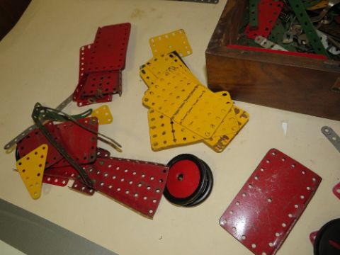 A MAHOGANY BOX OF MECCANO TOYS