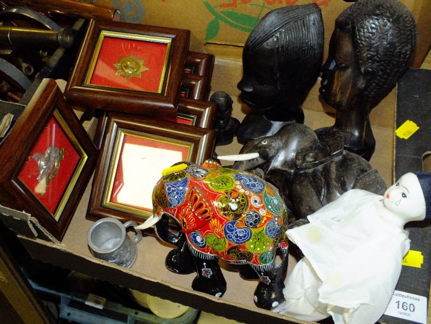 A SMALL TRAY OF COLLECTABLES TO INCLUDE AN EBONISED WOODEN ELEPHANT FIGURE AND FRAMED AND GLAZED CAP BADGES