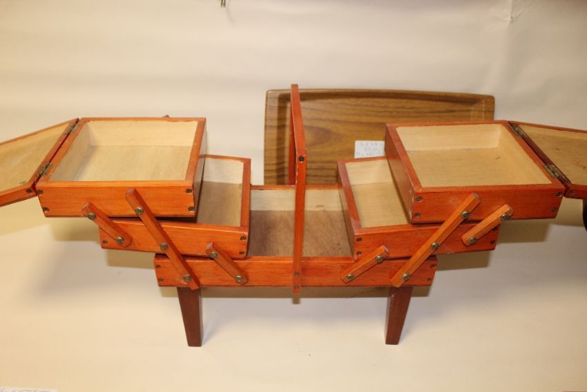 A WOODEN FOLD OUT SEWING BOX TOGETHER WITH A WOODEN SERVING TRAY