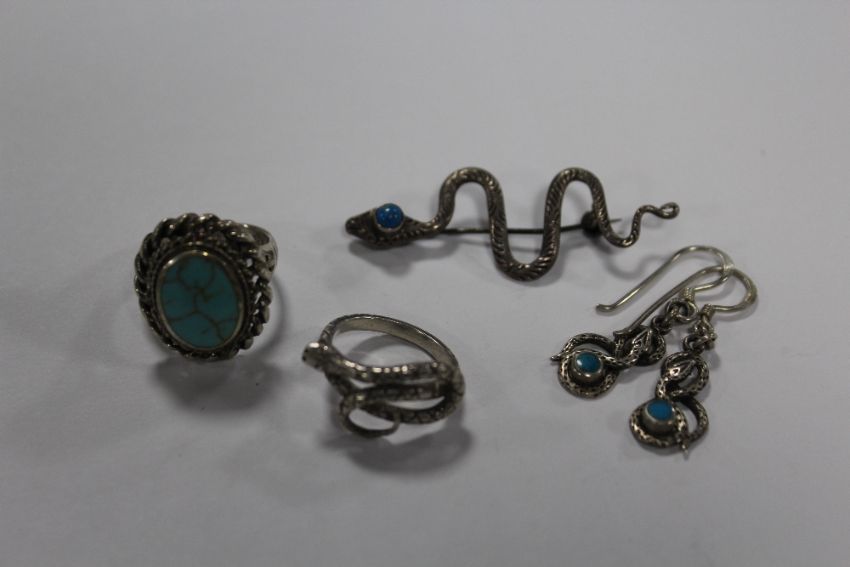 A COLLECTION OF STERLING SILVER AND WHITE METAL SNAKE SHAPED JEWELLERY, TOGETHER WITH A SILVER AND TURQUOISE DRESS RING