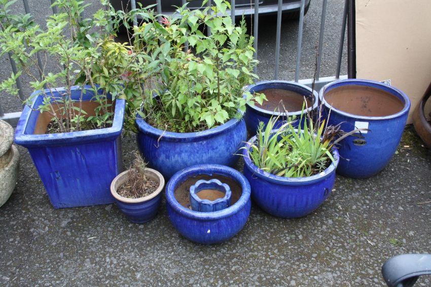 EIGHT BLUE GLAZED PLANT POTS LARGEST H-42 CM ( WITH CONTENTS )