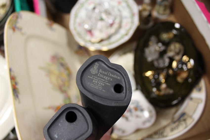 A TRAY OF CERAMICS AND GLASSWARE TO INCLUDE AYNSLEY