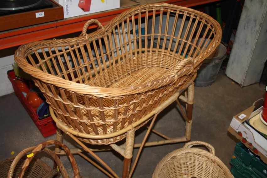 A SELECTION OF WICKERWARE TO INCLUDE A COT AND BASKETS