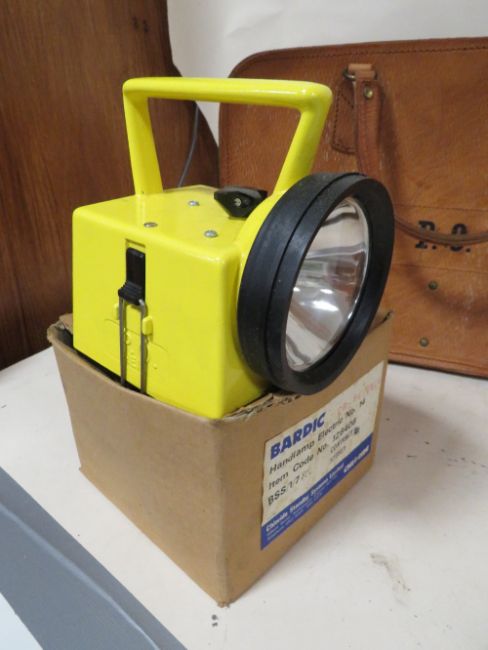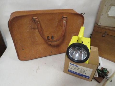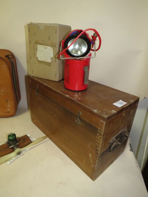 A WOODEN GPO LIDDED BOX TOGETHER WITH AN OLDHAM GPO NO13 LAMP AND A BARDIC CHLORIDE LAMP, PROPELLER AND A LEATHER BAG