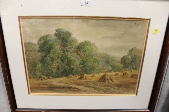 A FRAMED AND GLAZED WATERCOLOUR DEPICTING A RURAL SCENE, WITH CORN STOOKS , SIGNED W. RAMSEY LOWER RIGHT - 52.5CM X 36CM