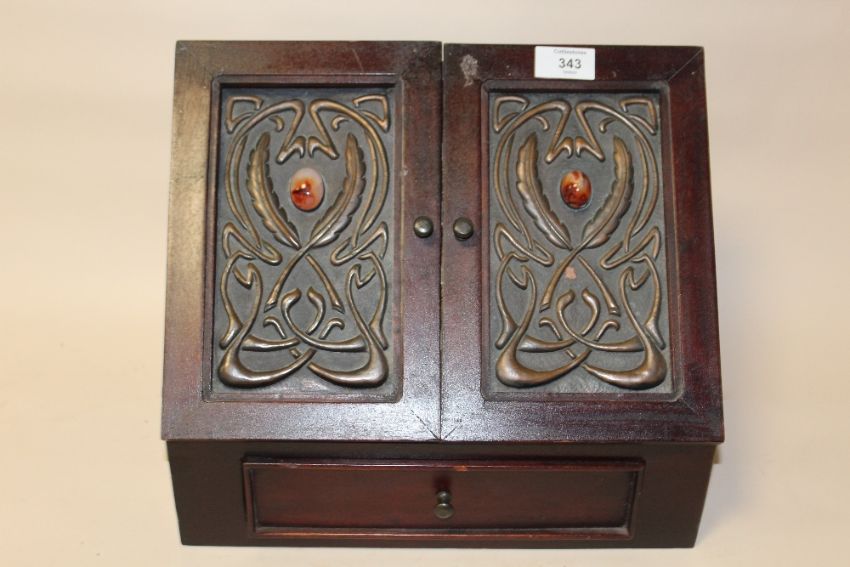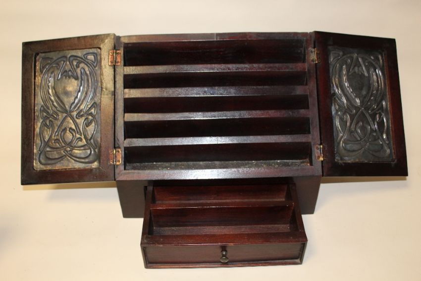 A REPRODUCTION MAHOGANY LETTER RACK WITH ART NOUVEAU STYLE PANEL