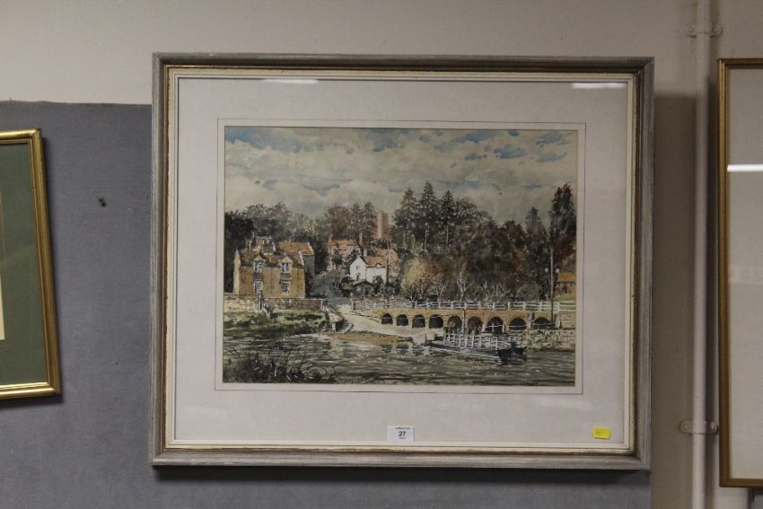 A FRAMED AND GLAZED WATERCOLOUR ENTITLED ARLEY FERRY (WORCS) SIGNED R W DICKENS LOWER CENTRE - 50.5 CM BY 36.5 CM