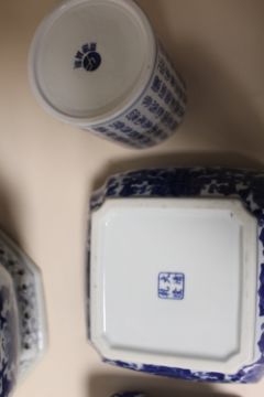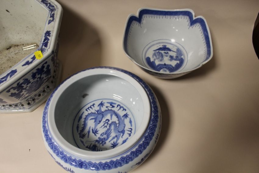 A COLLECTION OF MODERN CHINESE / ORIENTAL BLUE AND WHITE CERAMICS TO INCLUDE FIVE CLAWED DRAGON PATTERN BOWL, OCTAGONAL PLANTER ETC. (5)