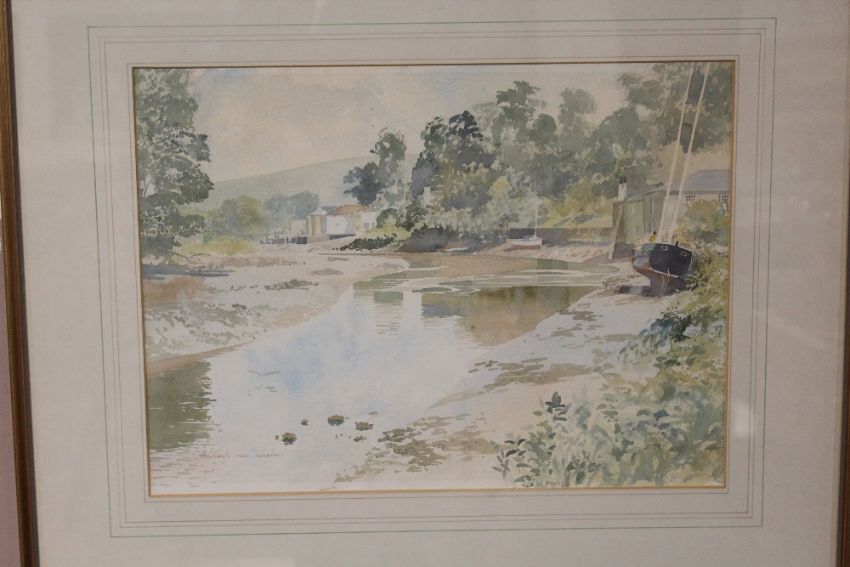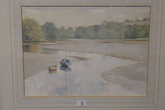 A PAIR OF GILT FRAMED AND GLAZED WATERCOLOURS DEPICTING RIVER/ESTUARY SCENES WITH MOORED BOATS BY MARK GIBBONS - 50CM X 37CM