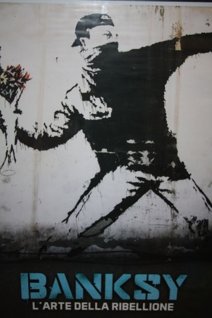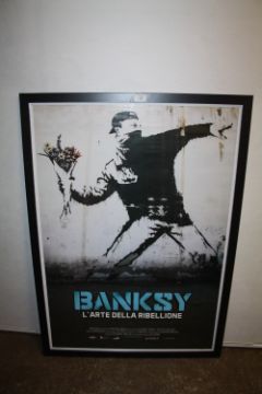 A LARGE FRAMED AND GLAZED BANKSY L'ARTE DELLA RIBELLIONE PRINT OVERALL SIZE INCLUDING FRAME - 105CM X 75CM
