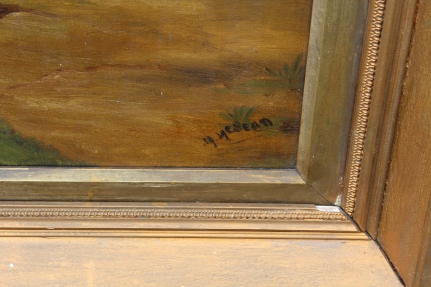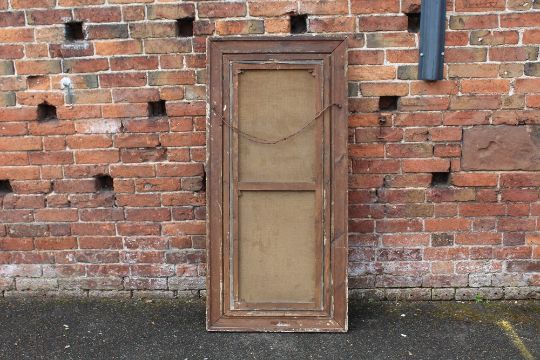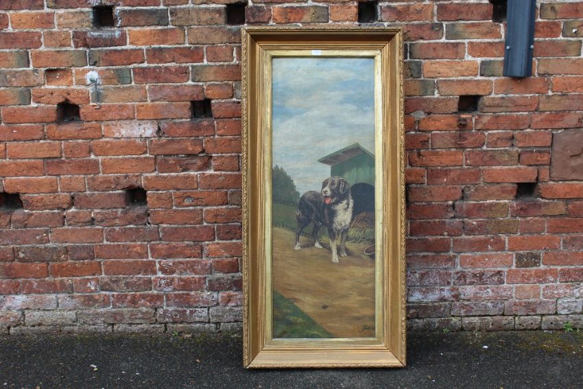 A LARGE 19TH/20TH CENTURY OIL ON CANVAS OF A DOG OUTSIDE A KENNEL INDISTINCTLY SIGNER LOWER RIGHT 44CM BY 121 CM