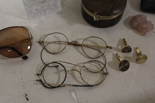 A SELECTION OF COLLECTABLES TO INCLUDE A CUT GLASS INKWELL, VINTAGE SPECTACLES ETC