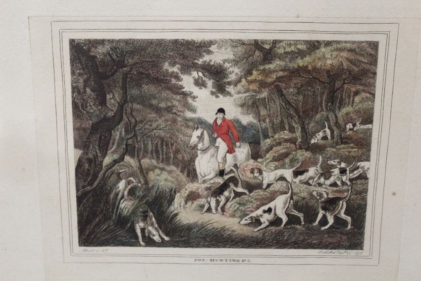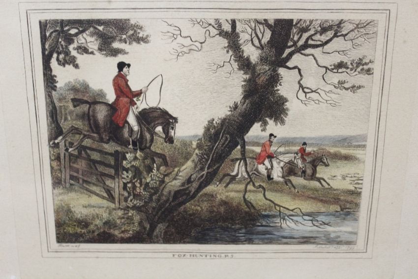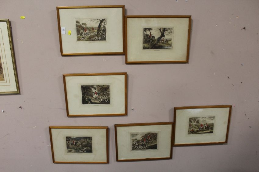 A SET OF SIX HAND COLOURED HUNTING SCENE ENGRAVINGS