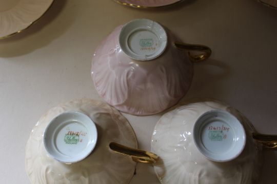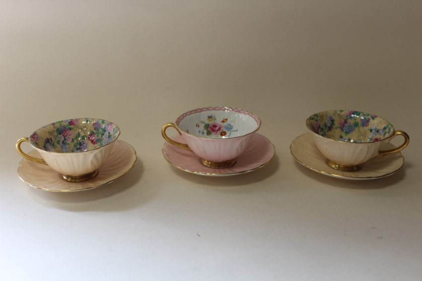 THREE VINTAGE SHELLEY CUPS AND SAUCERS WITH FLORAL INTERIORS, PINK EXAMPLE WITH DAMAGE TO BASE