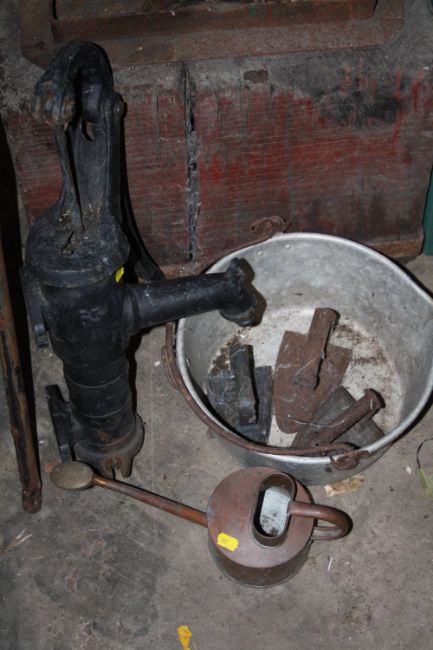 A COCKEREL WEATHER VANE TOGETHER WITH A CAST PUMP, METALWARE ETC