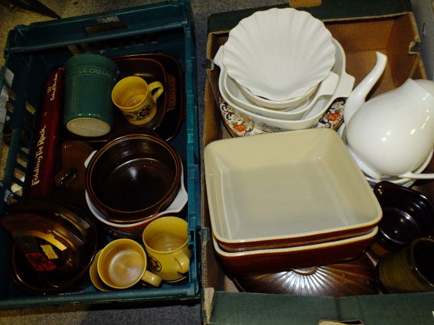 THREE TRAYS OF CERAMICS AND STONEWARE TO INCLUDE KILN CRAFT TEA WARE
