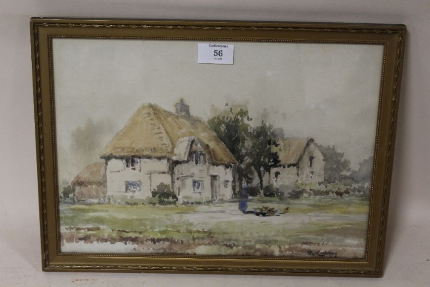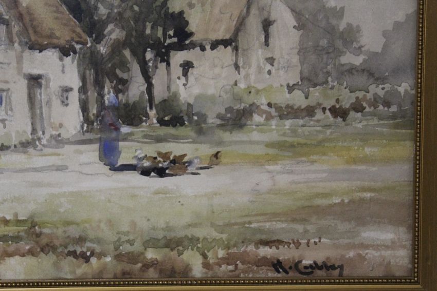 A FRAMED AND GLAZED WATERCOLOUR OF A FIGURE WITH CHICKENS BEFORE COTTAGES, SIGNED H. CUBLEY LOWER RIGHT, PICTURE 35.5 X 25 CM