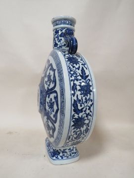 A LARGE CHINESE BLUE AND WHITE MOON FLASK VASE WITH BLUE CHARACTER MARKINGS TO BASE, H 51 CM, W 34 CM
