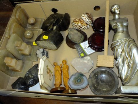 A TRAY OF COLLECTABLES TO INCLUDE ART DECO ONYX BOOK ENDS