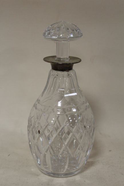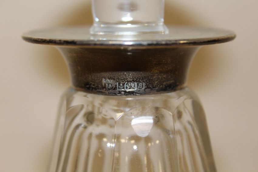 A HALLMARKED SILVER RIMMED CUT GLASS DECANTER OVERALL HEIGHT INCLUDING STOPPER - 25CM
