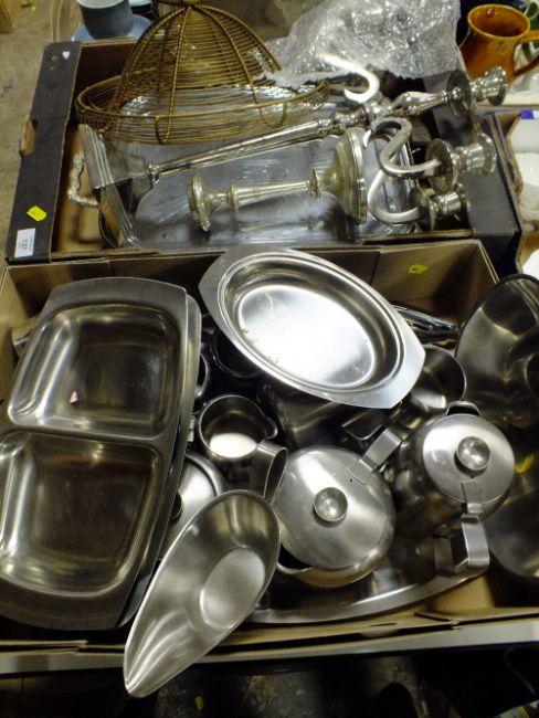 TWO TRAYS OF METALWARE TO INCLUDE OLD HALL STAINLESS STEEL AND FIVE BRANCH CANDELABRA
