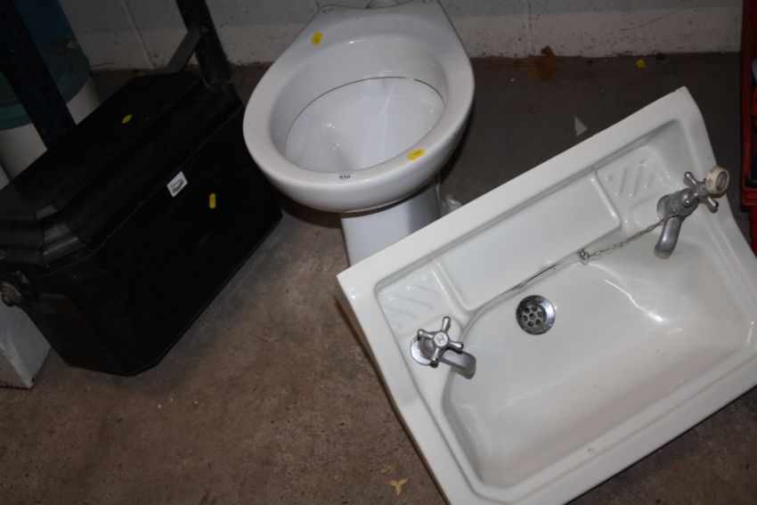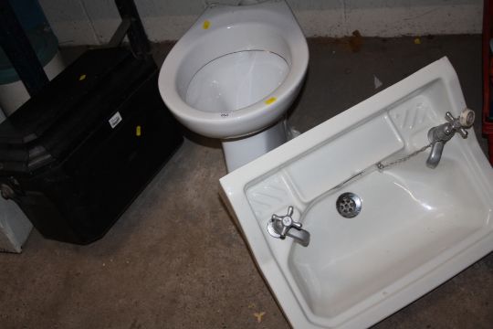 A CERAMIC TOILET AND SINK TOGETHER WITH A BAKELITE TOILET CISTERN